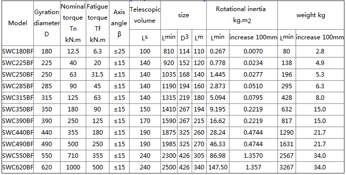 SWC-BF standard telescopic flange type universal coupling is used to connect shaft drive of two different axes. It can not be buffered and damped. It adopts integral fork structure. The bearing is fixed without bolts, which avoids the loose and broken bolts and is easy to maintain. It has long service life, high reliability, large bearing capacity and large inclination. It can work under the condition of β≤5°~25°. Suitable for rolling machinery, lifting and transportation, construction machinery, petroleum machinery and other heavy machinery.